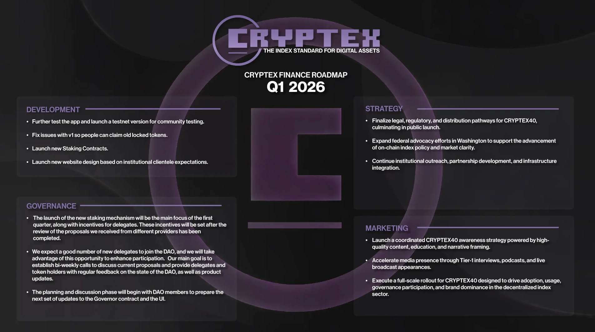 Q1 will see the launch of our redesigned staking contracts, which incorporate the incentive framework developed in Q4. These contracts represent a significant upgrade to our token economics, providing clear, sustainable rewards for long-term CTX holders who actively participate in governance.