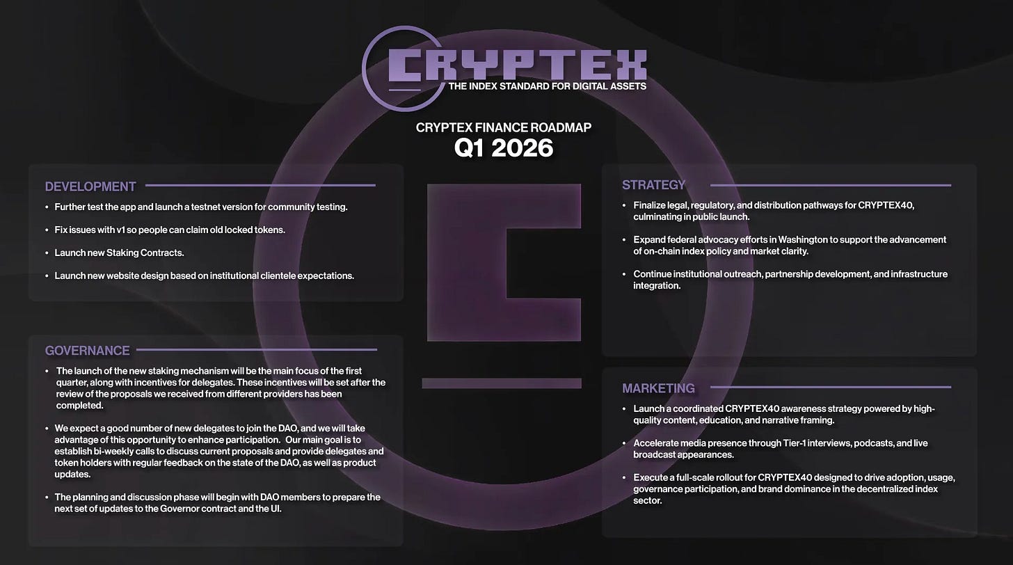 As Q4 closes and Q1 begins, Cryptex Finance stands at the threshold of transformation. CRYPTEX40 isn’t a roadmap promise anymore—it’s a completed product undergoing final testing before mainnet deployment. The specification is public. The regulatory pathways are navigated. The institutional interest is validated. The community is expanded and ready.